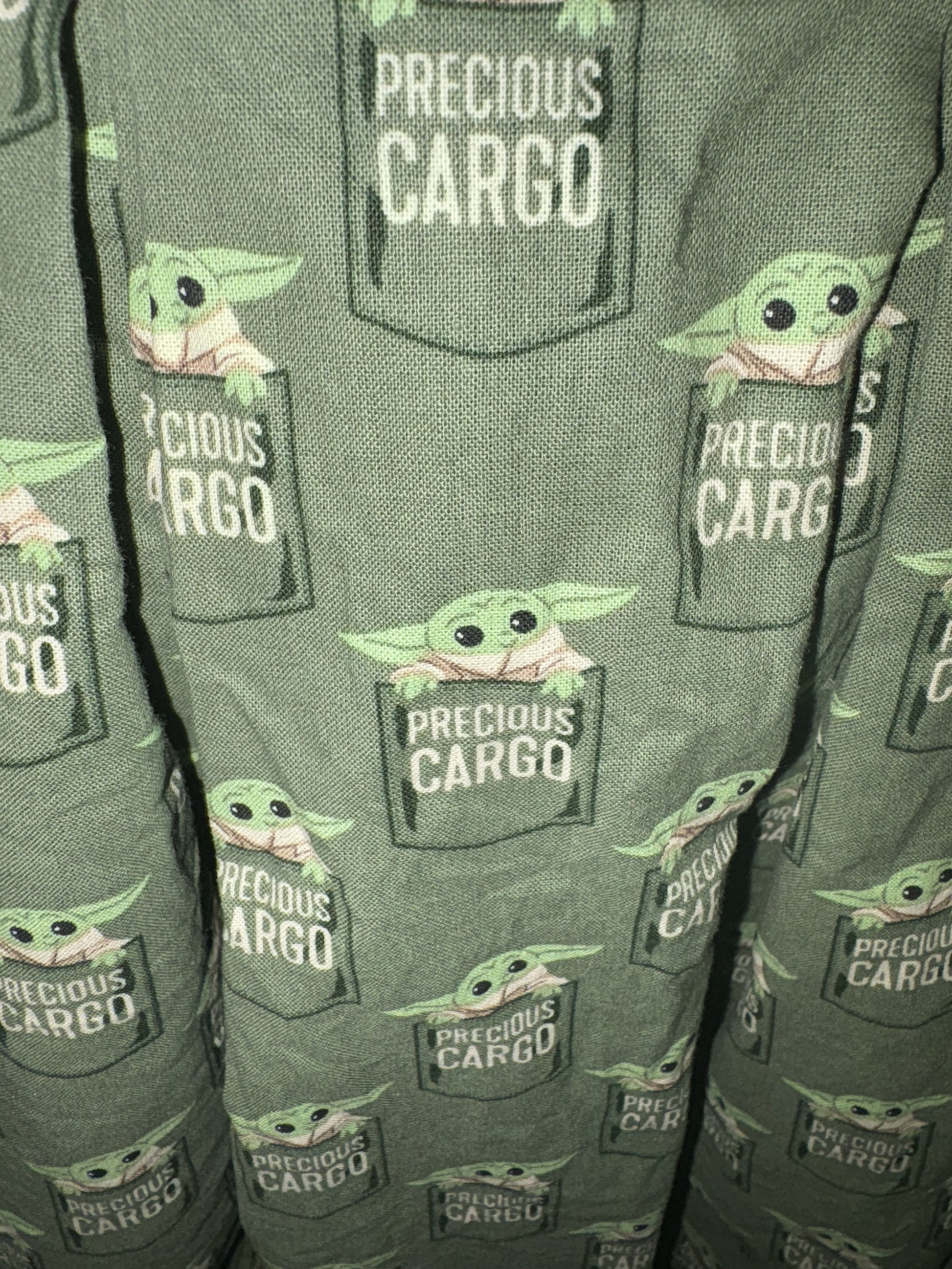 Bring some galaxy-sized cuteness to your wardrobe with this olive green skater skirt featuring an allover Grogu (Baby Yoda) print from Star Wars: The Mandalorian. Perfect for cosplay, Disney trips, or just showing off your fandom in everyday outfits. The high-waisted, flowy silhouette is flattering and comfortable for all-day wear.